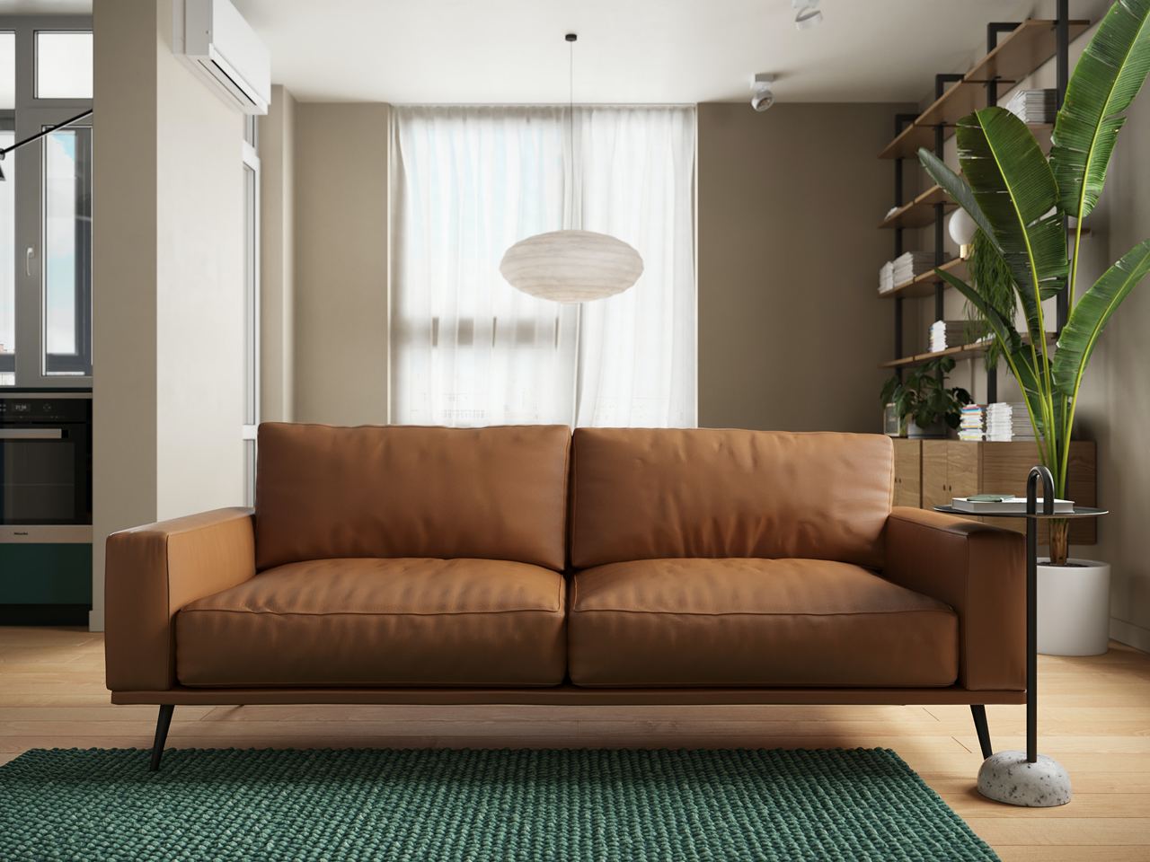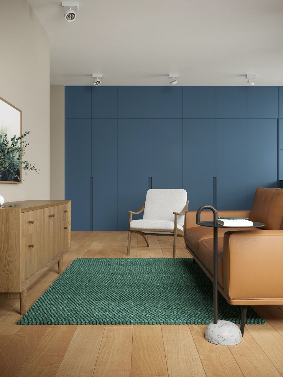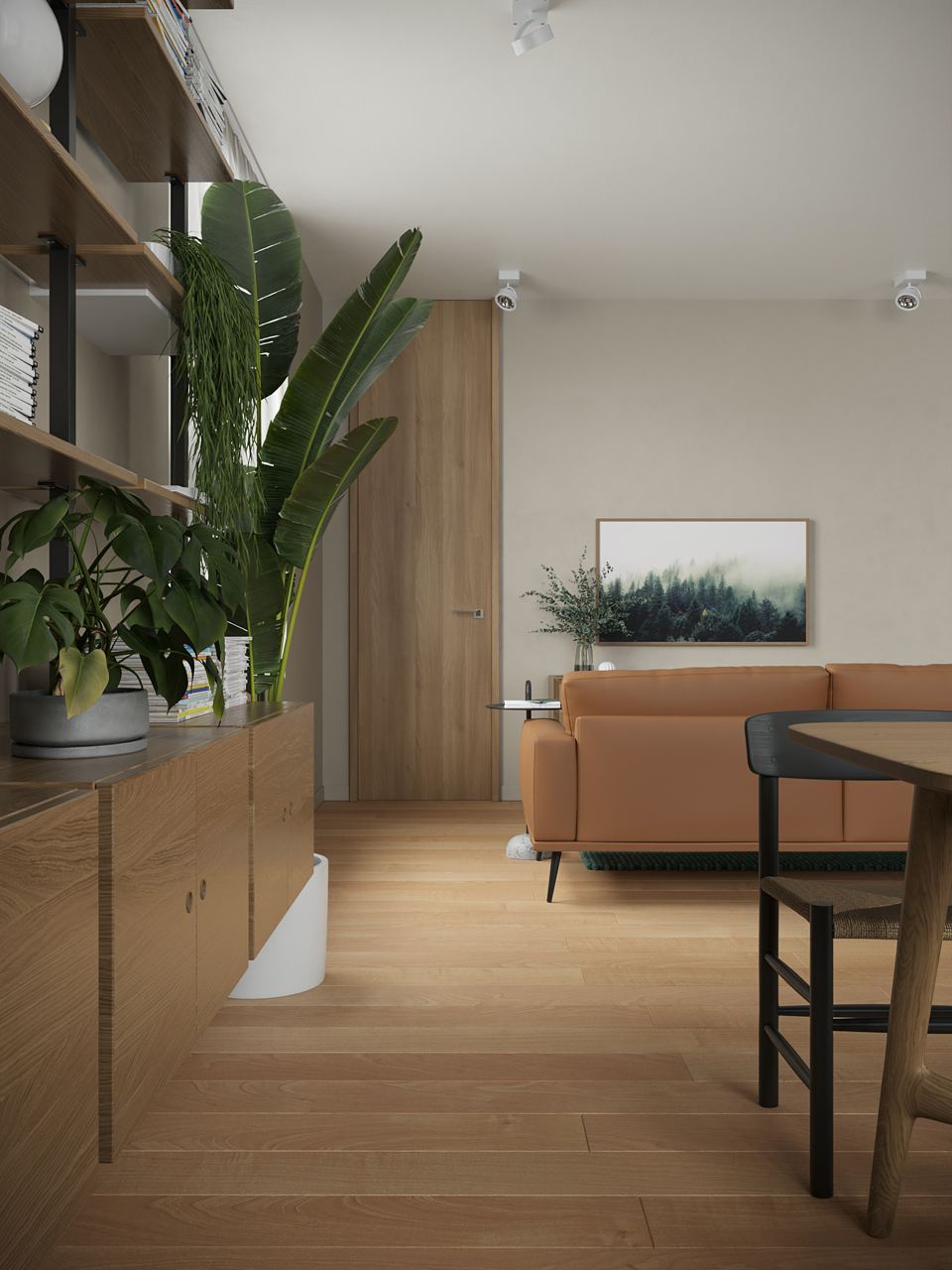 This stylish 61 m² studio apartment combines coziness and functionality, embodying modern minimalism with retro touches. The interior design is thoughtfully curated, blending wood, natural materials, and lush greenery in perfect harmony.