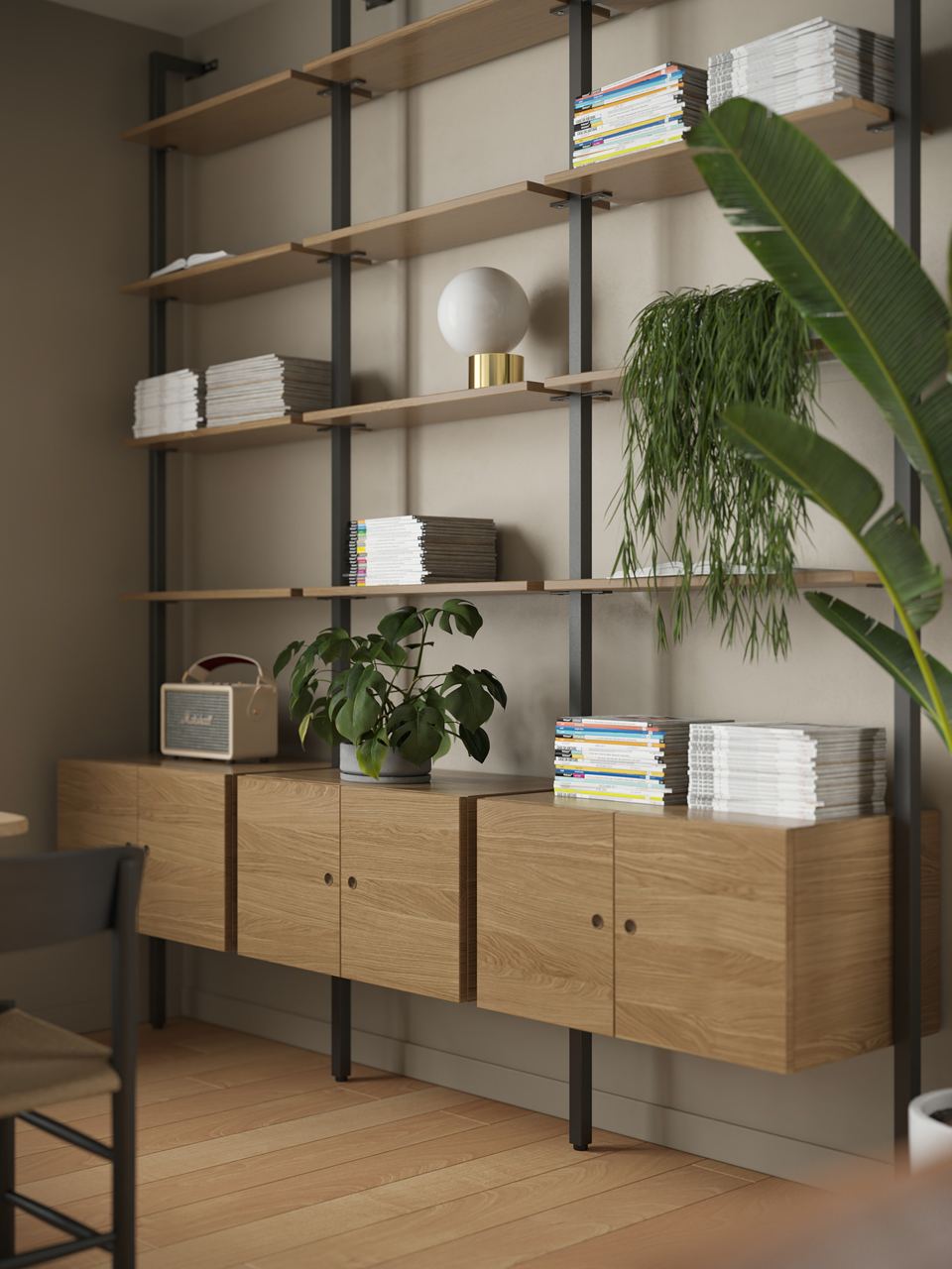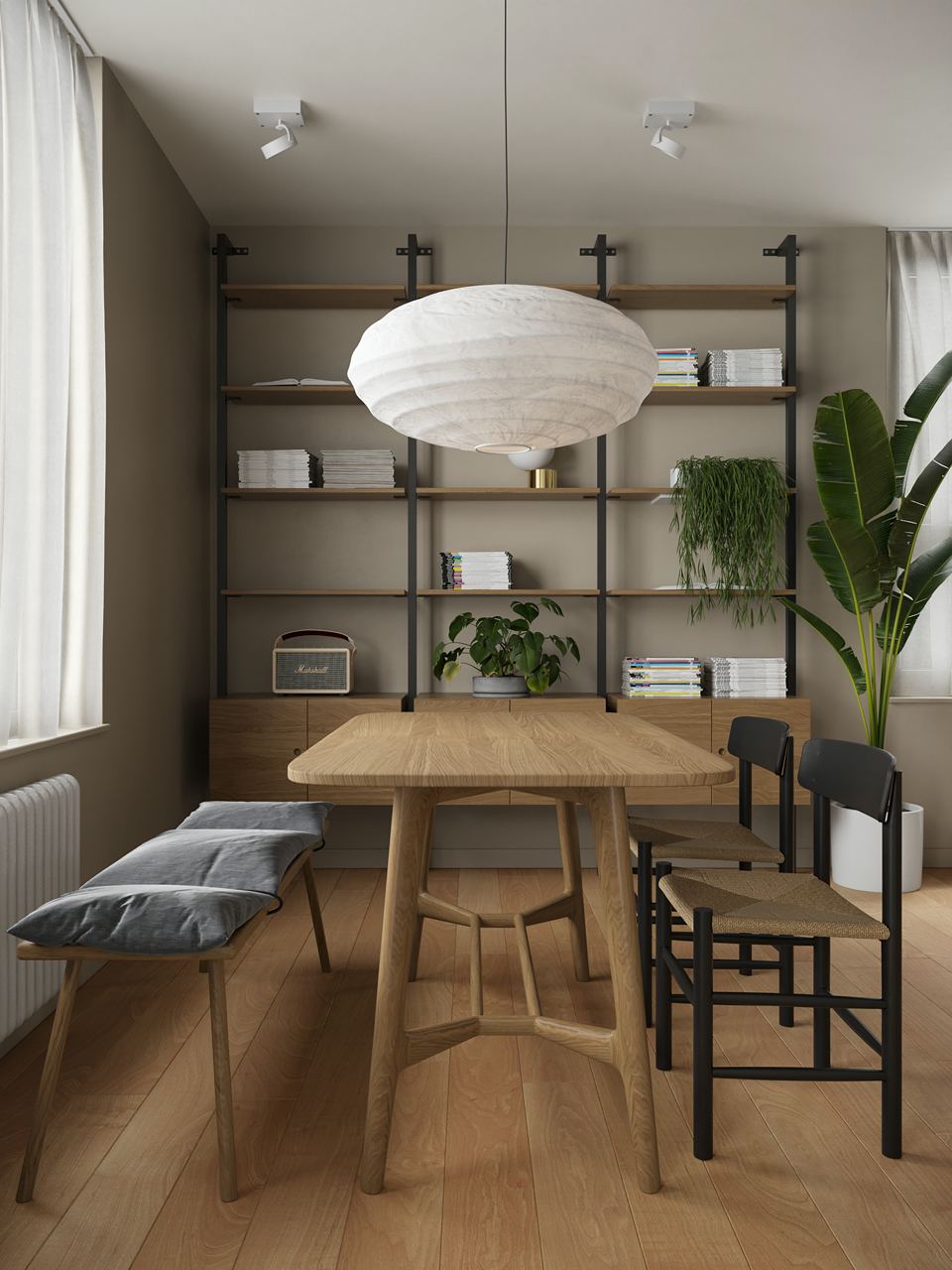 Greenery: A variety of live plants enhance the cozy atmosphere and bring a touch of nature, perfectly complementing the minimalist design.