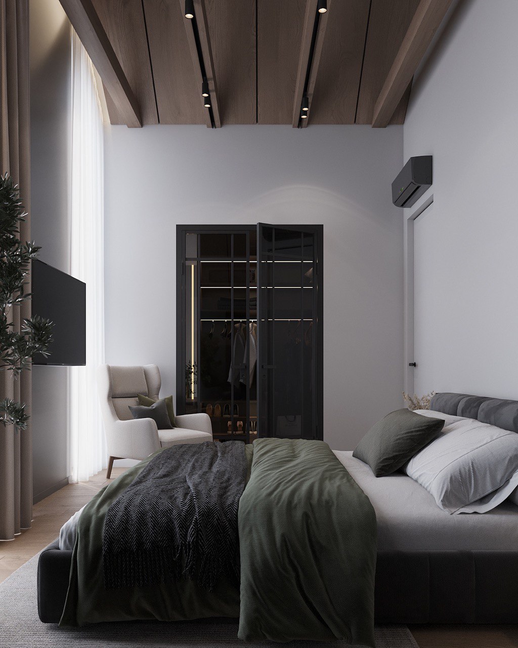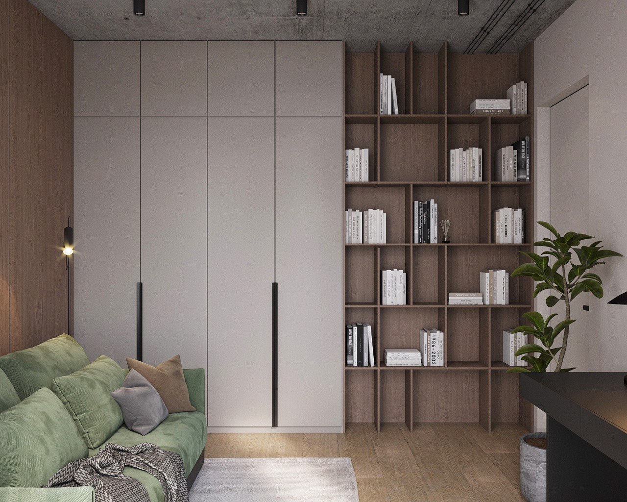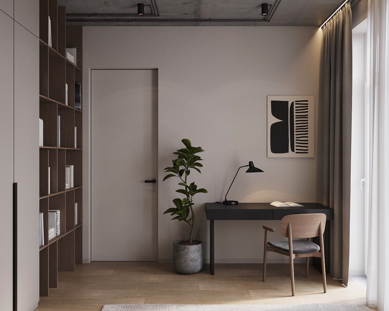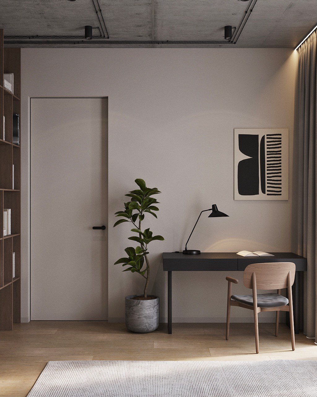 Decor Elements – Minimalist styling with a focus on textures: exposed beams, wooden and metal shelving, and lush greenery in large planters.
