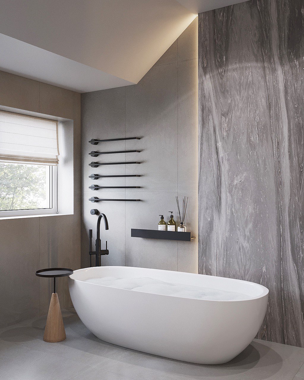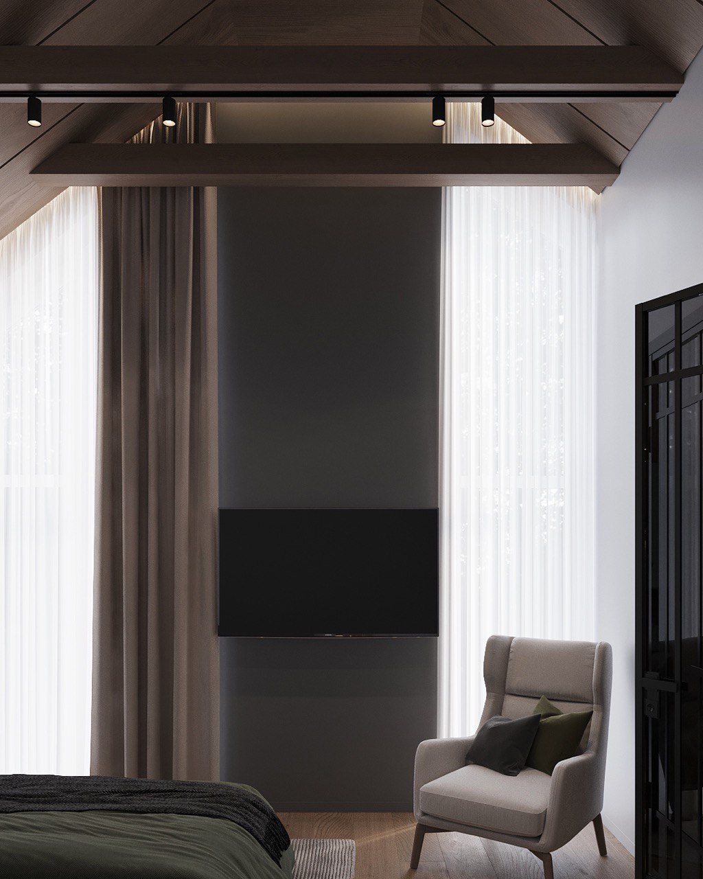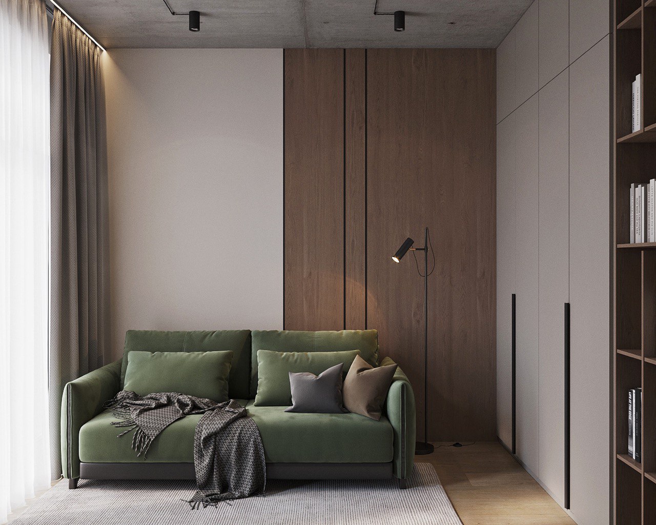 Design Concept – A mix of exposed concrete, metal structures, and wooden elements creates a raw yet balanced aesthetic.