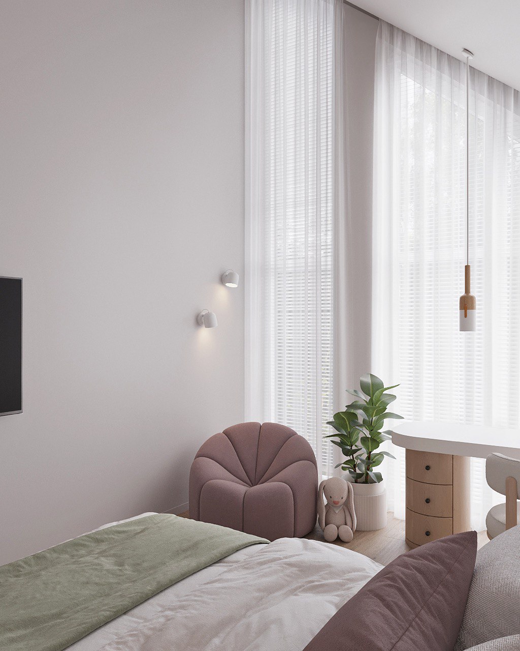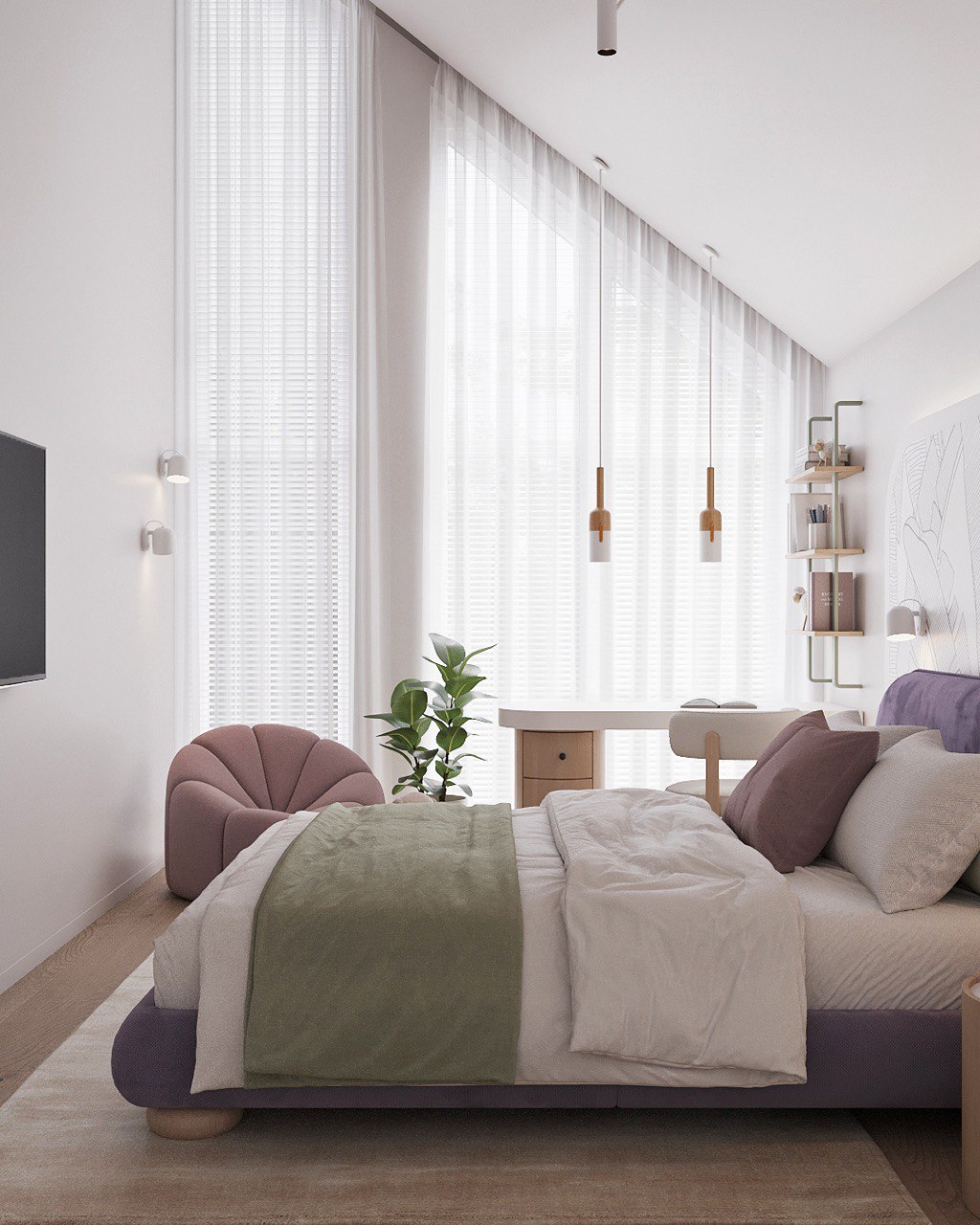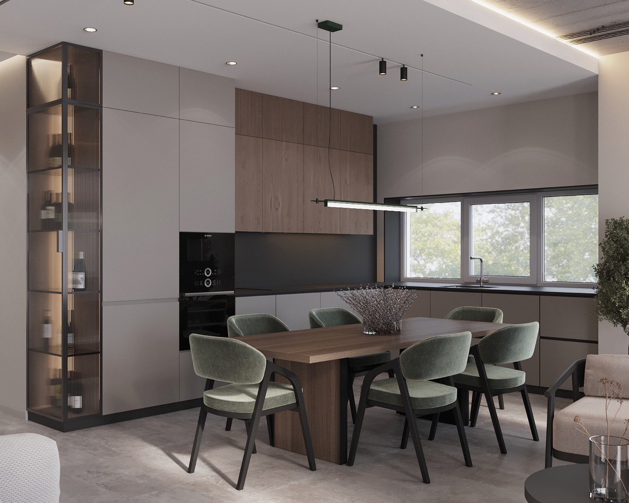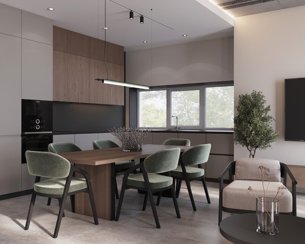 Living Area – An open-plan space combining the kitchen, dining, and lounge zones, with floor-to-ceiling windows filling the interior with natural light.